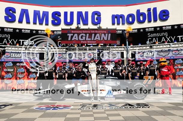 Alex Tagliani, que largara desde la pole position en la primera carrera de esta noche en el Texas Motor Speedway, comento que espera lograr mas pole position dentro de la categoría y que en la primera carrera cuidara su auto para la segunda por que si sufrís un fuerte accidente podes quedarte sin correr la ultima carrera de este sábado.
