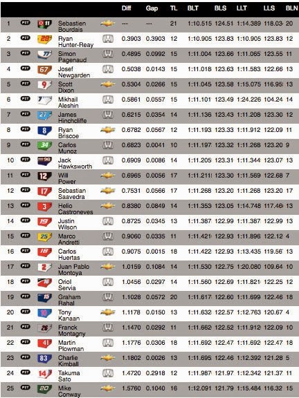 Bourdais y el segundo, que fue el excampeón Ryan Hunter-Reay (Andretti Autosport), fueron los únicos en llegar el 1:10. y quedó a 0s390 del francés, que llegó a correr en la Fórmula Uno. Simon Pagenaud, del equipo Schmidt Peterson Hamilton Motorsports, se ubicó tercero después de haber estado al frente por unos minutos.