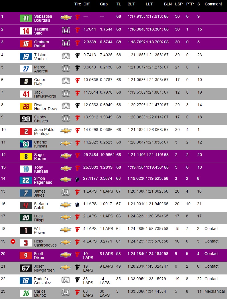 Pero dos choques entre Sage Karam y Jack Hawksworth, uno entre Dixon y Charlie Kimball, y otro más entre Power y Castroneves, obligaron la salida del Pace Car en cuatro ocasiones extra y que incluyó la bandera roja que marcó el cambio en el recorrido final; a pesar de los intentos de Sato para acercarse en los últimos 3 giros, Bourdais se llevó la victoria por 33ra ocasión en competencias de primer nivel en Estados Unidos.