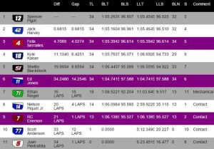 Reemplazante de Max Chilton este fin de semana, el brasileño Nelson Piquet Jr., que largó primero con uno de los autos del equipo Carlin Racing, tenía la carrera controlada, pero el estadounidense RC Enerson, de Schmidt Peterson Motorsports, le arruino la carrera cuando se lo llevo puesto y este protagonizo un estremecedor accidente, donde salió volando. El hecho ocurrió en el final de la recta opuesta, la más larga del trazado.