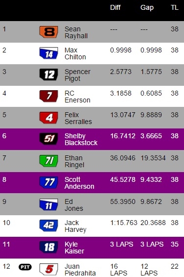 Max Chilton (Carlin Racing) volvió a subir al podio y culmino segundo, delante de Spencer Pigot (Juncos Racing), el que mejor salió ganando del incidente entre Jones y Harvey, quienes siguieron corriendo y fueron 9° y 10° respectivamente.
