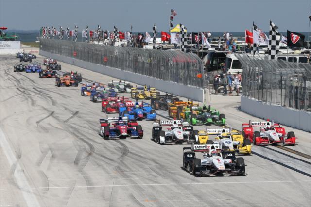 En una carrera que también vio el debut del colombiano Gabby Chaves y del monegasco Stefano Coletti, el regreso de Simona de Silvestro, Francesco Dracone y Luca Filippi, así como la expansión de Team Penske a cuatro autos, Juan Pablo Montoya logró su primera victoria en categorías de autos formula en Estados Unidos desde 2000 tras mantener a raya, e incluso tener un contacto, con su coequipero en Team Penske, Will Power, en las últimas 27 de las 110 vueltas pactadas.