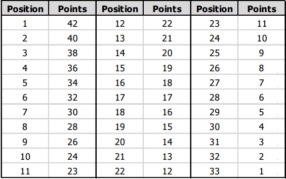 Quien logre la pole position se llevará 42 puntos para su cuenta en el certamen; el segundo obtendrá 40 y así sucesivamente, hasta que el sitio 33 sume una unidad.