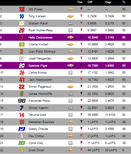 Kanaan, quien llegó a 75 podiums en su carrera, junto con Graham Rahal completaron el podium, en una jornada en la que el líder y sublíder de la puntuación general sufrieron contratiempos que les hicieron perder terreno en la carrera al título: Simon Pagenaud tuvo problemas de motor en las últimas vueltas, similar a lo que ocurrió en la Indy 500, por lo que un podium potencial se convirtió en un 13er lugar.