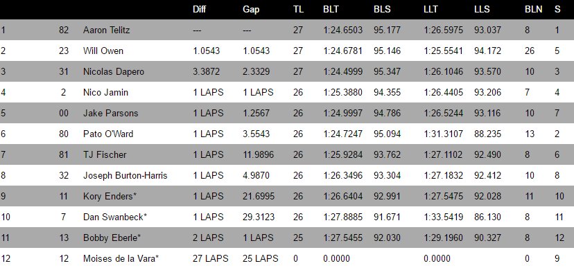 Con este resultado, Telitz llegó a seis triunfos en el año y terminó con 32 puntos más que Patricio O’Ward, quien en su segunda temporada en la categoría quedó subcampeón, a pesar de ganar siete pruebas, dos de ellas en el icónico Indianapolis Motor Speedway.