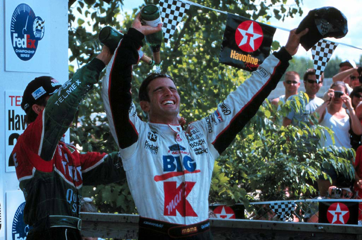 2004: Alex Tagliani (cen.) esperó 85 participaciones para subir a lo más alto del podium, en una edición del GP de Road America en la que inició 13° y, gracias a una bandera amarilla, le bastó con superar a Rodolfo Lavín (der.) a cuatro vueltas del final. Es su única victoria en la especialidad (FOTO: Archivo)