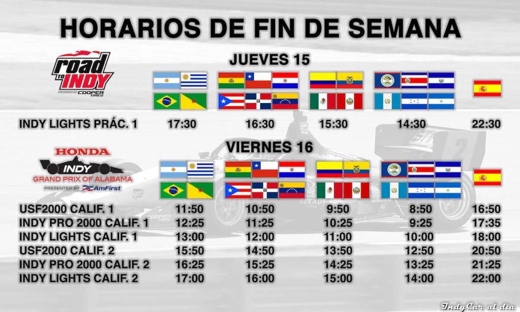 La acción de Road to Indy iniciará este jueves con los tests oficiales y los primeros entrenamientos de Indy Lights; las tres categorías tendrán las calificaciones de sus dos válidas el viernes, para dedicar el sábado y domingo a las competencias.