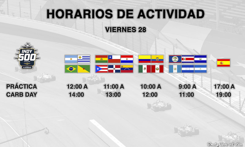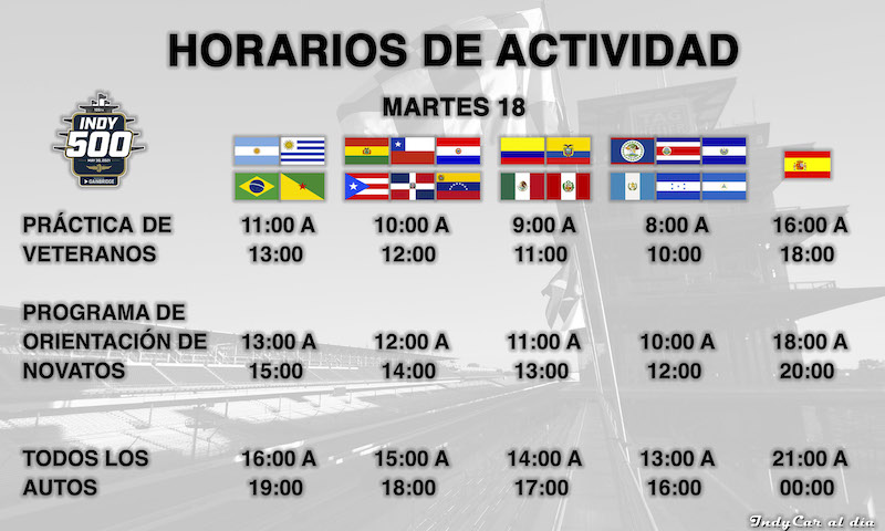 Horarios de actividades de todas las sesiones en pista de la NTT INDYCAR SERIES en el Indianapolis Motor Speedway para la 105º edición de las “500 Millas de Indianápolis”.