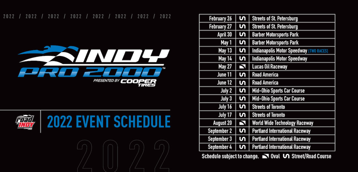Las temporadas 2022 de los campeonatos de Indy Pro 2000 y USF2000 se conformarán de 18 fechas, siendo parte de las actividades de casi todos los eventos de soporte de IndyCar.