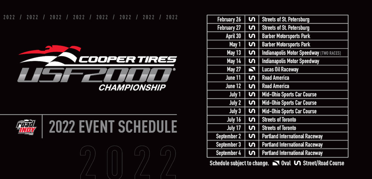El calendario de USF2000 será muy similar, aunque el evento en Lucas Oil Raceway nuevamente será el único en óvalos. También serán 18 carreras en nueve autódromos, habiendo fechas dobles en St. Petersburg, Barber, Road America y Toronto y fechas triples en el circuito mixto de Indy, Mid-Ohio y Portland.