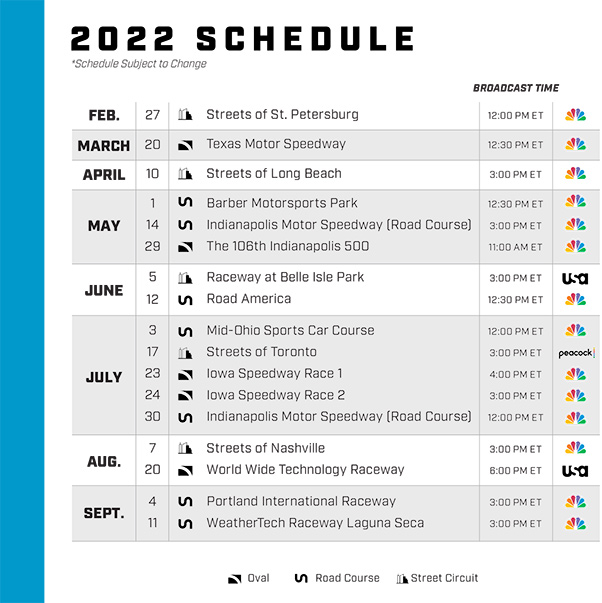 De esta forma, 2022 marca la primera vez que el calendario de una serie estadounidense no tiene carreras nocturnas desde 2007, en la temporada final de Champ Car.