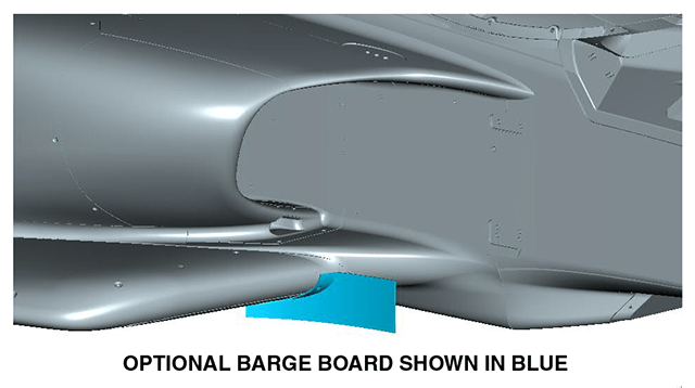 Adicionalmente, para este año se permitirá el uso de barge boards en los Dallara AK-18 en todos los óvalos, a excepción de Indy. Se espera que el uso de las piezas curvas de fibra de carbono, combinadas con un menor ángulo del alerón delantero, permita que los autos lo sigan más de cerca y eviten turbulencia adicional en las curvas, mientras se persigue a otro competidor.