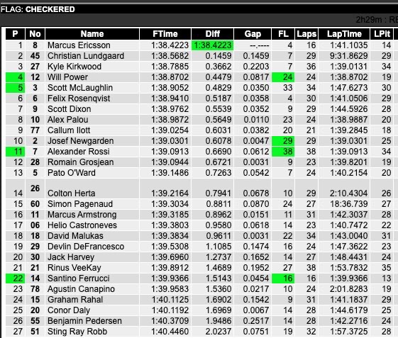De destacar que Callum Ilott volvió a ubicarse entre los diez mejores al marcar el noveno mejor registro con el No. 77 de Juncos Hollinger Racing; sin embargo, el británico fue sancionado por hacer wheelspin en un cajón de pits ajeno al suyo, por lo que se perdió los diez últimos minutos de la práctica.
